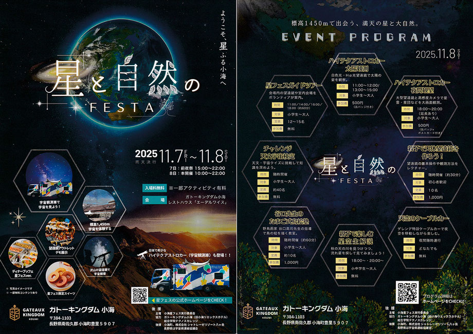 株式会社サイトロンジャパン(本社:東京都新宿区、代表取締役:渡邉晃)は、2025年11月7日(金)から11月8日(土)に長野県小海町のガトーキングダム小海・レストハウス「エーデルワイス」で開催される「八ヶ岳 星と自然のフェスタ」に出店いたします。