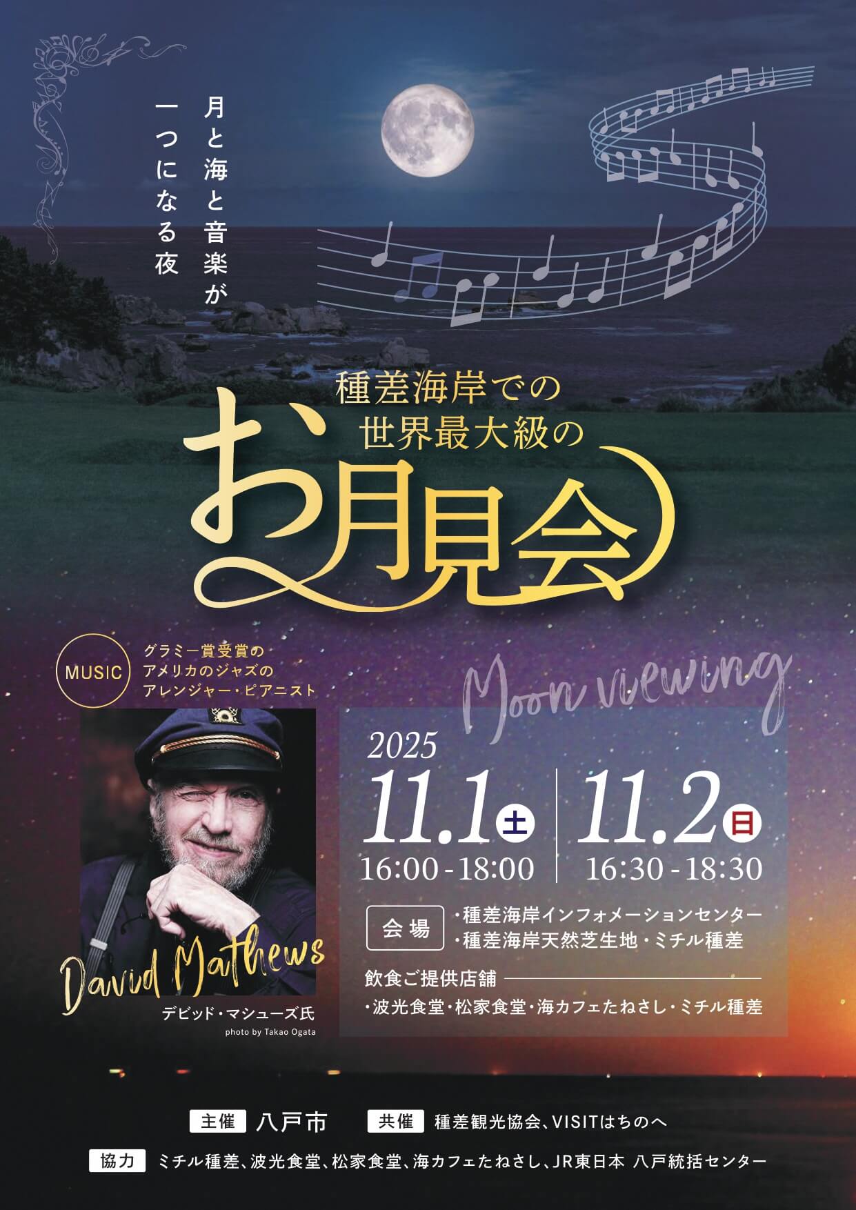 令和7年11月1日(土)・2日(日)、青森県八戸市の名勝「種差海岸」にて、詩人・草野心平氏が“ザボンの月”と称えた美しい月を楽しむ世界最大級のお月見会が開催されます。海岸に広がる天然芝生地で、昼間とは異なる幻想的な月夜の風景をお楽しみください。
