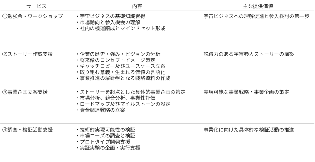 また、構築したストーリーを基に、本格的な事業企画や技術検証にもスムーズに移行可能です。ALTILANの持つ事業開発と宇宙業界の知見を融合し、各企業の段階や課題に最適な形式で支援を実施します。