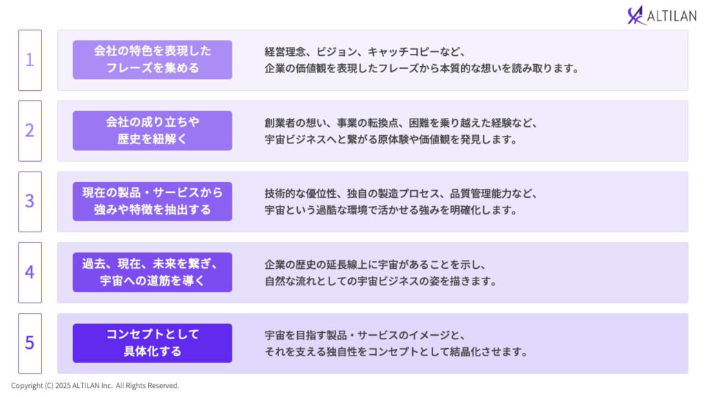このアプローチでは、企業の本質的な価値や理念を起点に宇宙への挑戦理由を丁寧に構築。培ってきた歴史や想い、強みを宇宙という舞台で活かし、どのような未来を描けるかを物語として提示します。