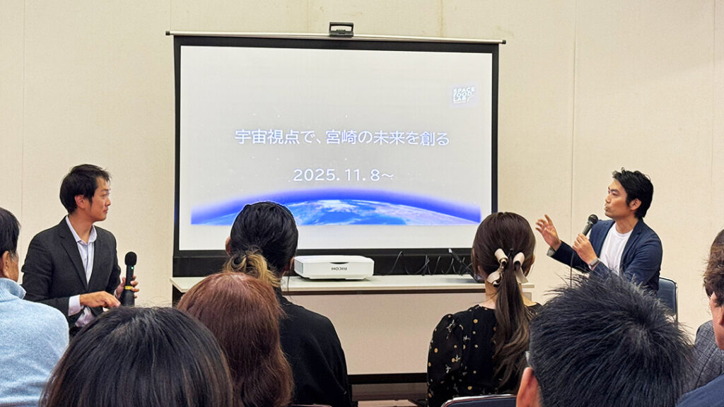 宇宙と日常生活との関わり、さらには宮崎県が宇宙産業にどのように関わることができるかといった実践的な議論が展開されました。県内の経営者を中心に約35名が参加し、対談後の懇親会では、地域産業と宇宙の可能性について活発な意見交換が行われました。