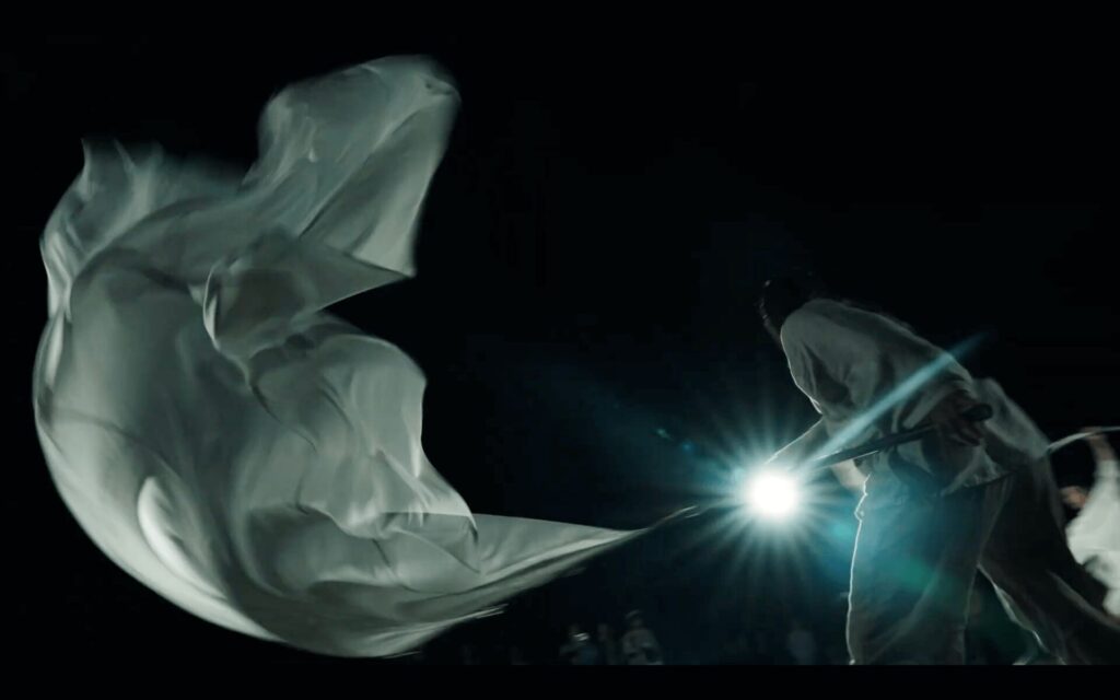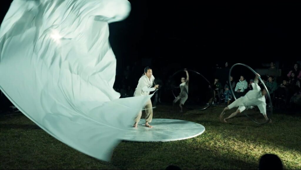 シルホイールと大旗という独自の組み合わせによる身体表現は、重力と浮遊のあいだを行き交う動きが特徴で、静けさと緊張感が同居する荘厳な空気をまとっていました。迫力ある演技に観客は次第に引き込まれ、節目ごとに大きな拍手が送られ、中には感動のあまり目を潤ませる来場者の姿も見られました。