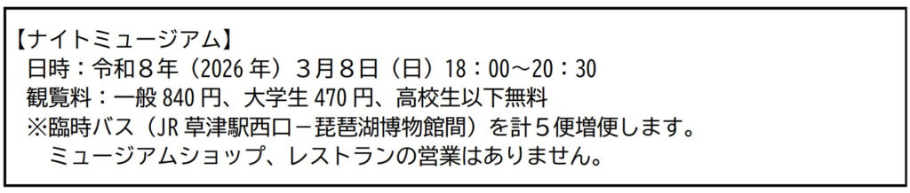 琵琶湖博物館では、令和8年(2026年)3月8日(日)に「ナイトミュージアム」、3月20日(金・祝)に宿泊付きの「プレミアムナイトツアー」を実施します。展示室の特別照明やクラシックコンサート、近江の地酒の試飲、学芸員による展示解説など、通常の開館時間では体感・体験できないコンテンツをご用意し、夜ならではの博物館をお楽しみいただきます。